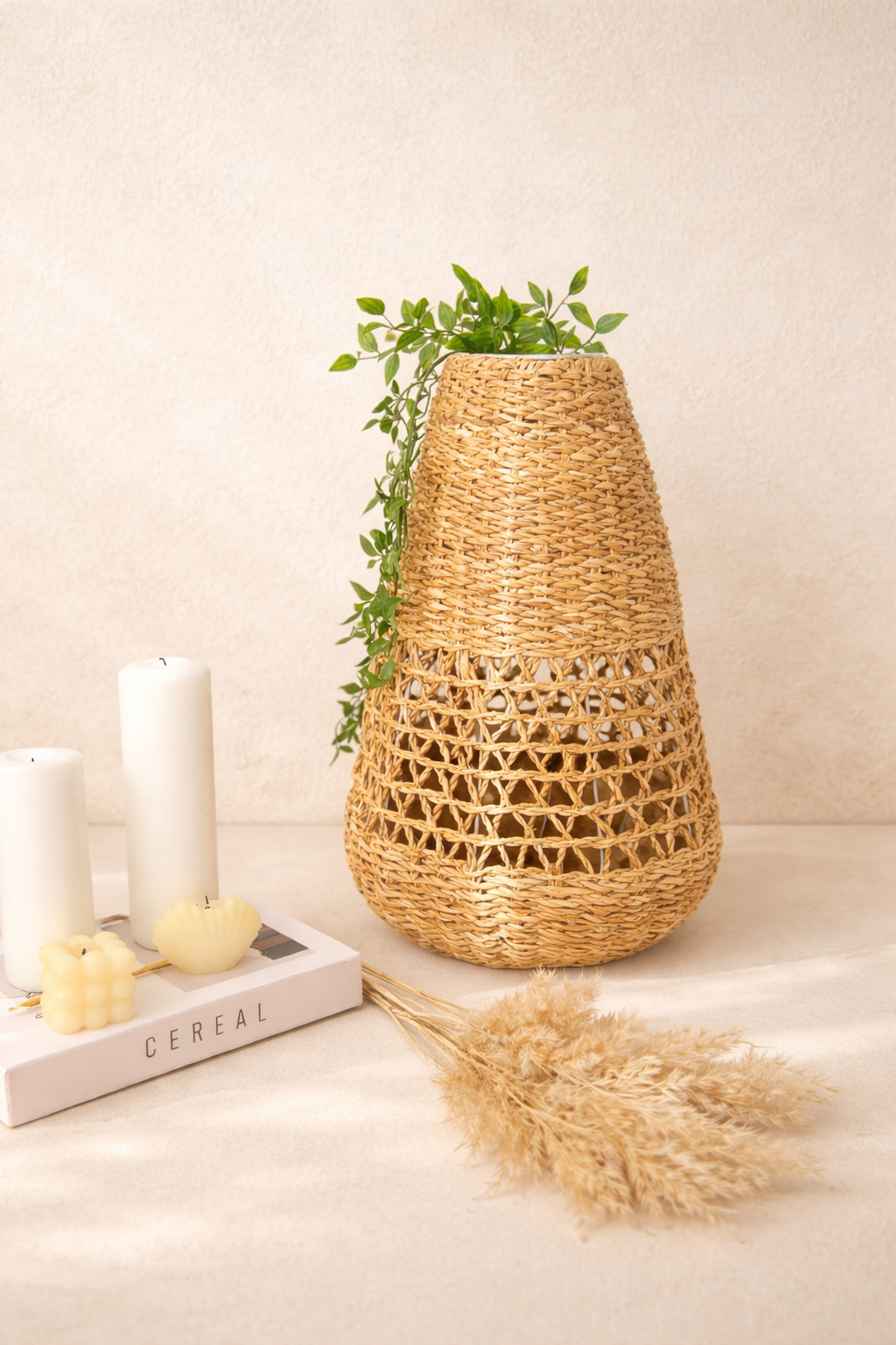 %100 el yapımı hasır malzemesiyle üretilmiş, dayanıklı ve uzun ömürlü kullanım sunar; Sağlam ferforje iskelet sistemi sayesinde, hem vazo hem de saksı olarak çok yönlü bir kullanım imkanı sağlar; Doğal hasır dokusuyla estetik bir görünüm kazandırırken, iç mekan dekorasyonunuza sıcak ve samimi bir hava katar;